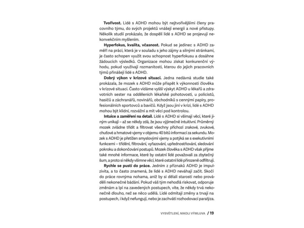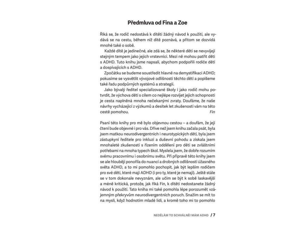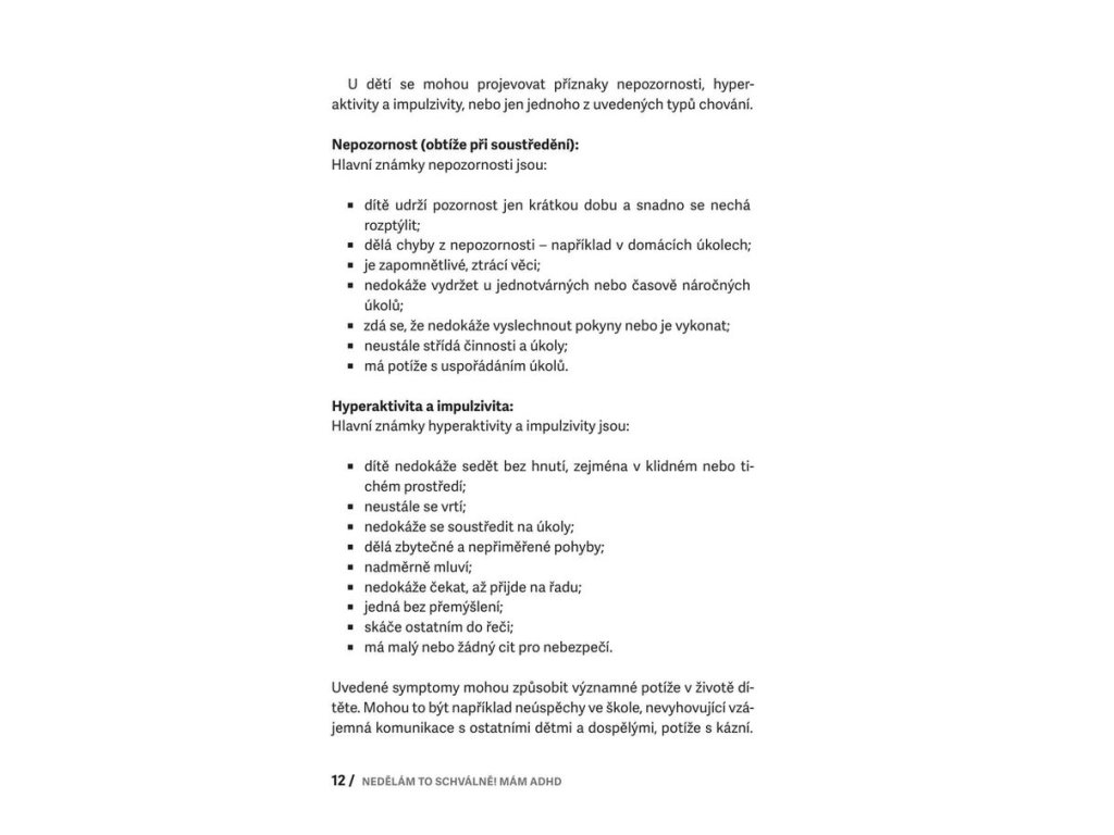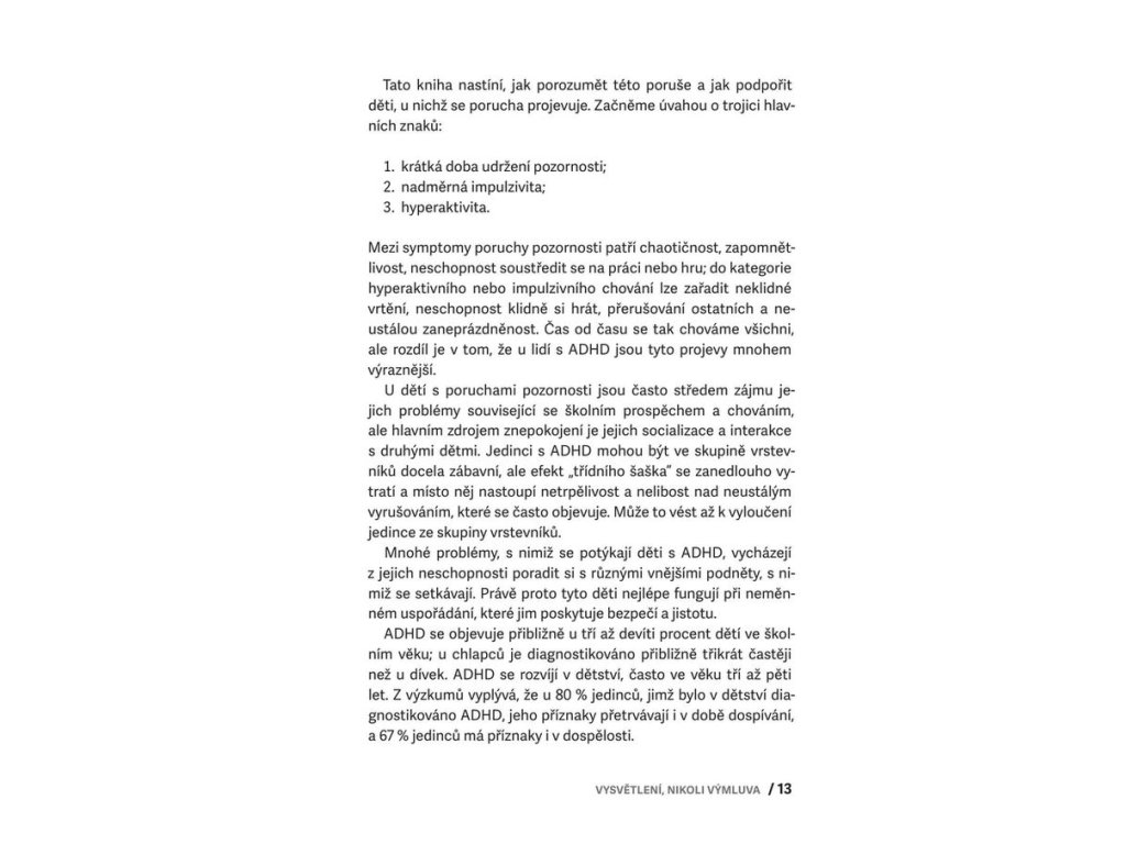 Tento průvodce nabízí vše, co potřebujete, pokud váš žák nebo potomek má ADHD, tedy poruchu pozornosti s hyperaktivitou. Nabízí základní orientaci v terminologii, odmaskovává obvyklé mýty o ADHD, ukazuje, jak s dítětem efektivně komunikovat a zejména pak ukazuje, jaké jsou cesty pro úspěšnou spolupráci rodiny a školy. Obsahuje jasná doporučení pro budoucnost dítěte s ADHD, podporu ve škole i doma a i pro další oblasti, tipy pro pedagogy a výchovné poradce, rychlou orientaci v souvisejících diagnózách včetně autismu.
