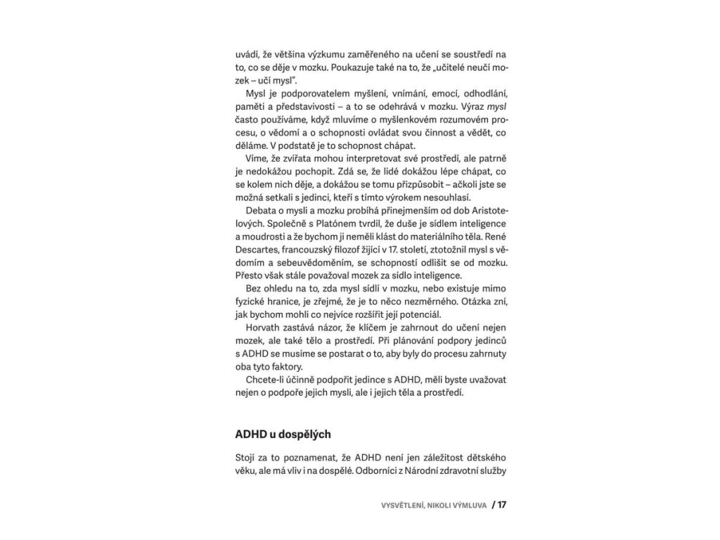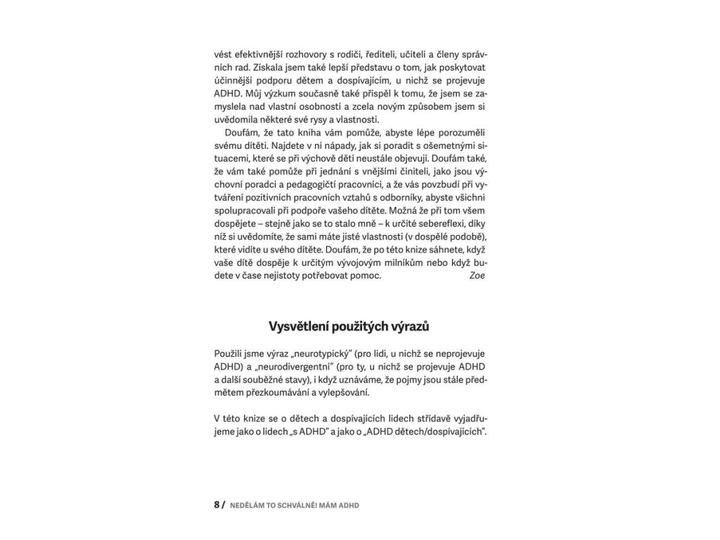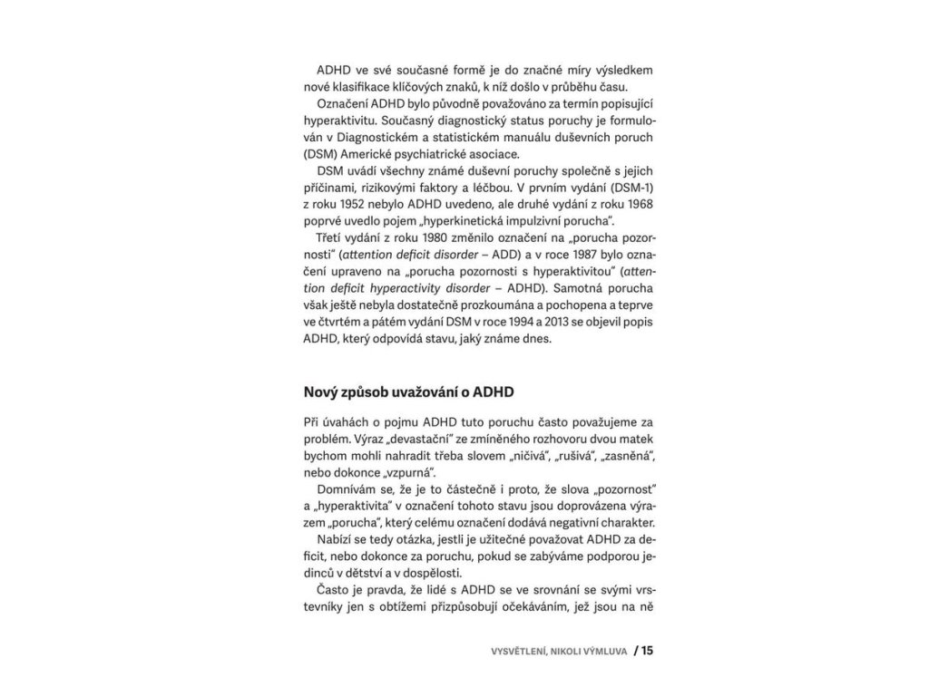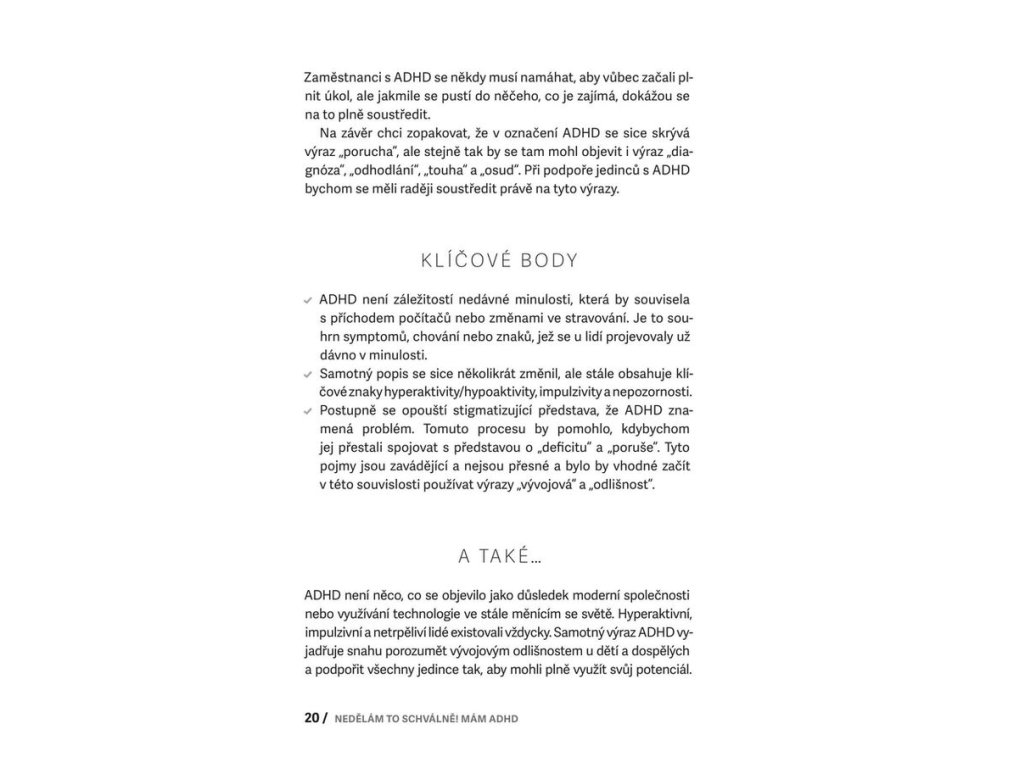 Tento průvodce nabízí vše, co potřebujete, pokud váš žák nebo potomek má ADHD, tedy poruchu pozornosti s hyperaktivitou. Nabízí základní orientaci v terminologii, odmaskovává obvyklé mýty o ADHD, ukazuje, jak s dítětem efektivně komunikovat a zejména pak ukazuje, jaké jsou cesty pro úspěšnou spolupráci rodiny a školy. Obsahuje jasná doporučení pro budoucnost dítěte s ADHD, podporu ve škole i doma a i pro další oblasti, tipy pro pedagogy a výchovné poradce, rychlou orientaci v souvisejících diagnózách včetně autismu.