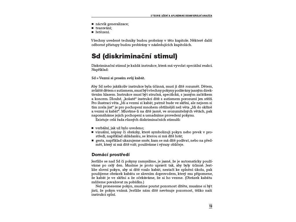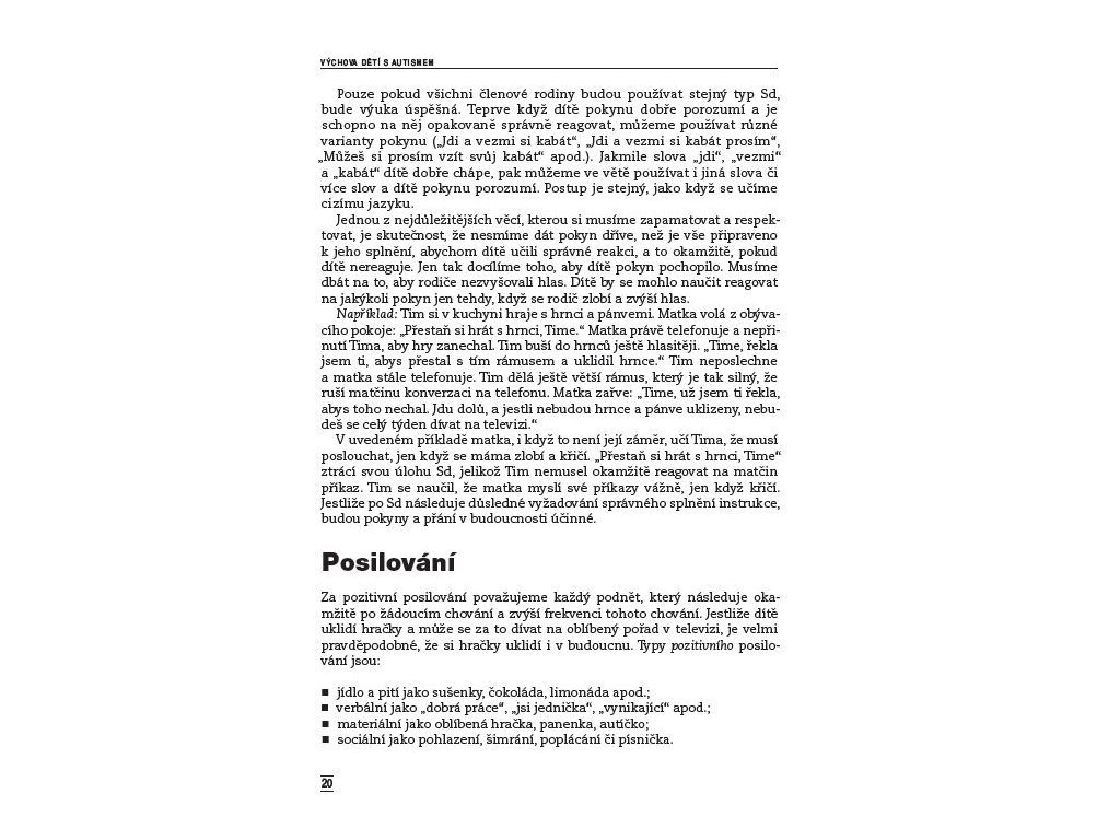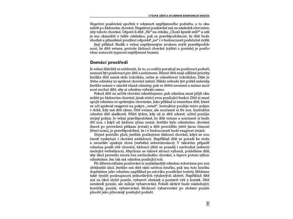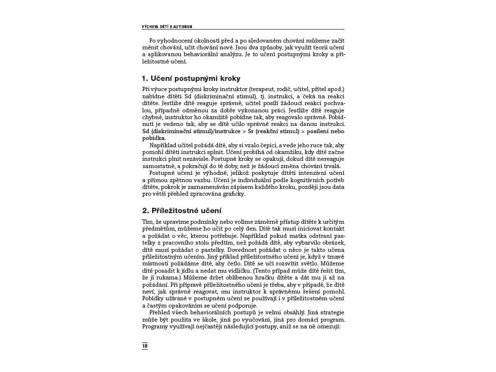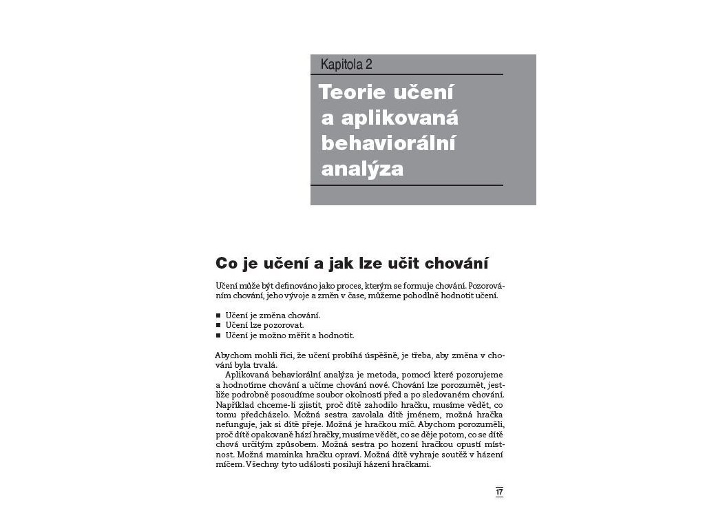 Aplikovaná behaviorální analýza Téměř všechny publikace o autismu v České republice nabízely jako nejvhodnější výchovnou strategii pro děti s poruchami autistického spektra strukturované učení. Žádná metoda však není použitelná pro všechny děti, a proto je důležité, aby odborníci a rodiče měli možnost vybrat si z více přístupů ten, který bude dítěti nejvíce vyhovovat. Kniha zkušené psycholožky přináší další efektivní výchovnou metodou - aplikovanou behaviorální analýzu. Autorka srozumitelně vysvětluje, jak lze tuto metodu využít především ke zlepšení sebeobslužných dovedností jako je jídlo, hygienické návyky nebo oblékání. Aplikovaná behaviorální analýza může také pomoci odstranit nežádoucí stereotypní chování, zlepšit hru, komunikaci, vztahy mezi vrstevníky či posílit nezávislosti dítěte. Kniha přináší užitečné informace nejen pro speciální pedagogy a vychovatele, ale také pro rodiče.