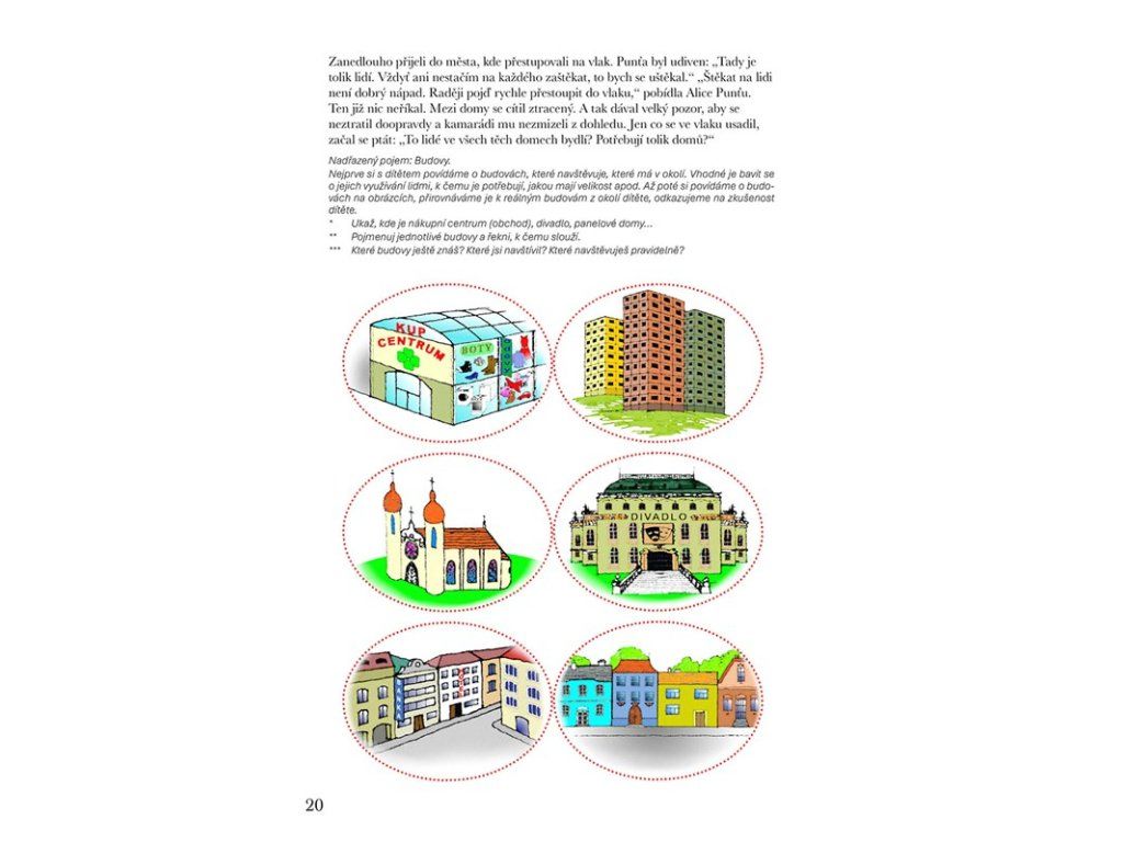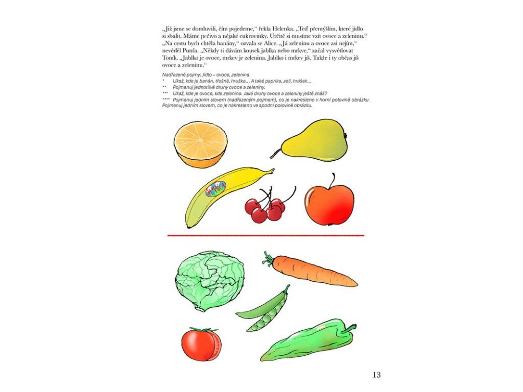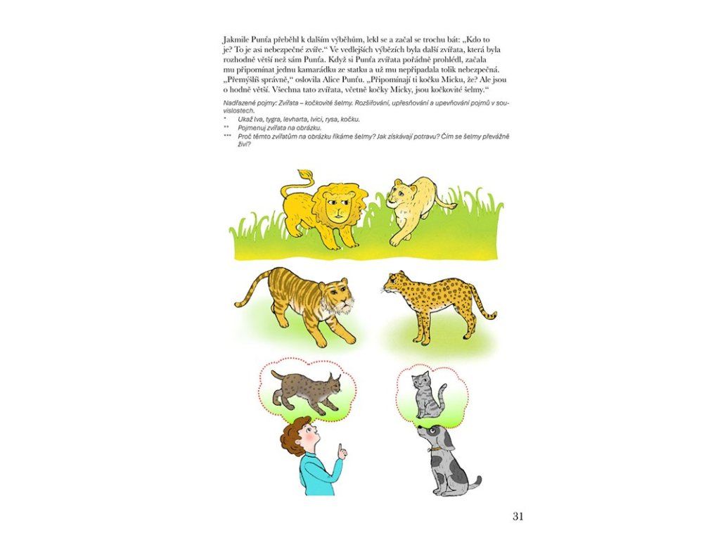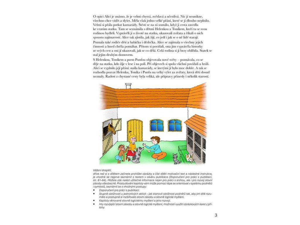 * Především systém podnětů pro rozvoj řeči a slovně logického myšlení formou povídání, her a dalších aktivit. Řazení činností kopíruje a respektuje vývojové fáze slovní zásoby a porozumění řeči od pasivní úrovně po aktivní slovník. Náročnost úkolů se stupňuje od těch pro dítě méně obtížných po obtížnější, představující vývojově vyšší roviny. Náměty jsou nabízeny tak, jak se dítě s pojmy a situacemi může setkávat. Je vytvářen prostor k propojování jednotlivých informací, přemýšlení ve vzájemných vazbách a souvislostech.
