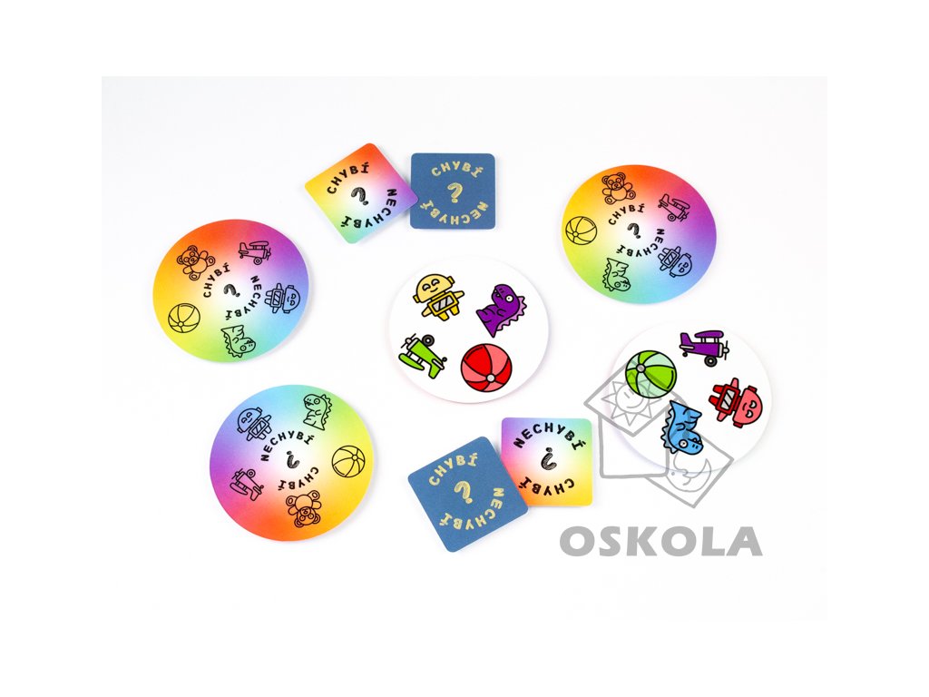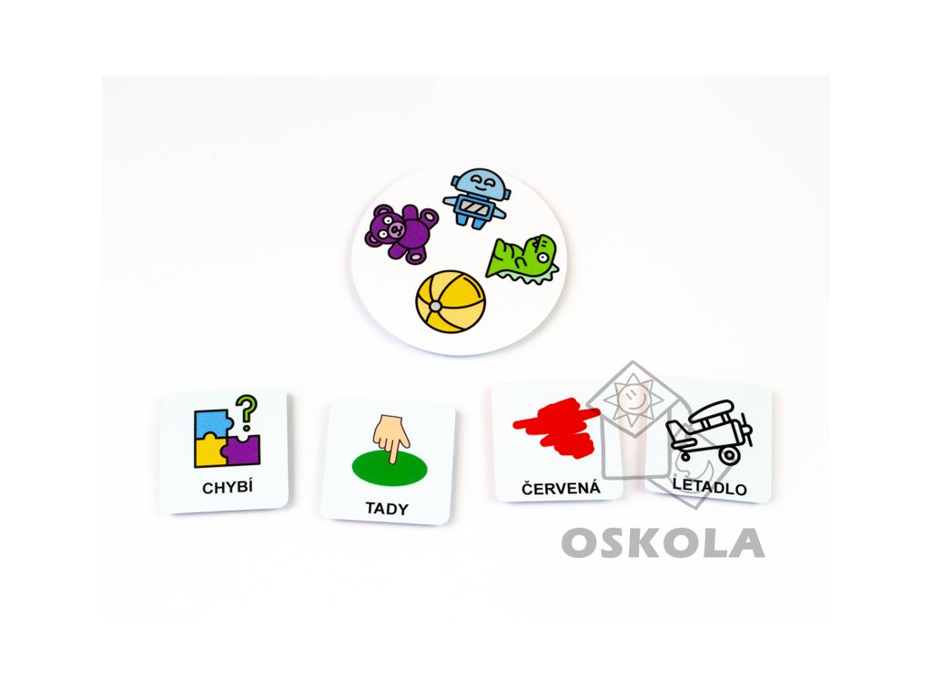 Tato originální logopedická hra podporuje rozvoj postřehu, slovní zásoby, gramatiky a tvorby vět. Na každé kartičce chybí jedna barva a jedna hračka — úkolem dítěte je rychle zjistit, co nevidí, a poté vytvořit správnou větu.