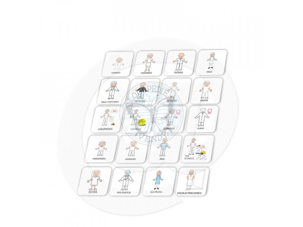 Set obsahující 20 piktogramů rodinných příslušníků a běžných osob (lékař, sestra, učitel, kamarád). Především pro děti se zhoršenou komunikační schopností.Magnetky jsou čtvercové 4,5×4,5cm se zaoblenými rohy. Pevné, tisk nezávadnými barvami z přírodních výtažků na magnetické fólii, což zvyšuje jejich odolnost. Jsou otíratelné. Svým rozměrem jsou kompatibilní se všemi výrobky a okénky na magnetických tabulích či s ostatními magnetickými pomocníky (viz. podkategorie Podklady na magnetky a Magnetické lišty a tabule).