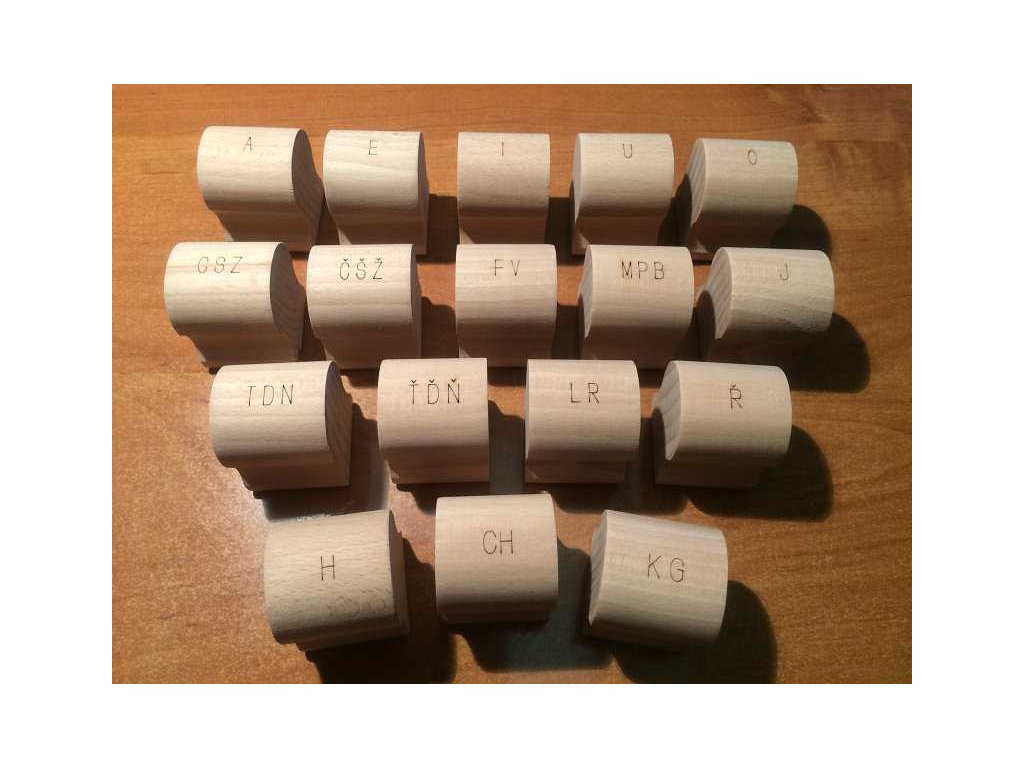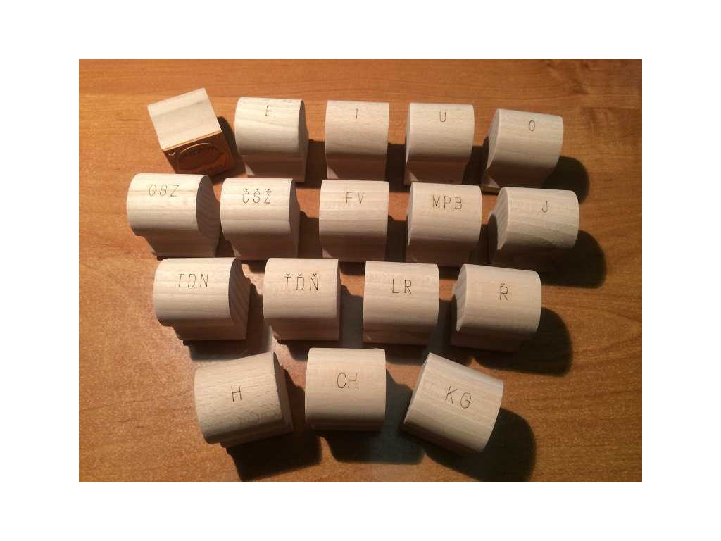 Razítka jsou na dřevěném masivním držátku. Každé razítko má označení, které hlásky se týká.
