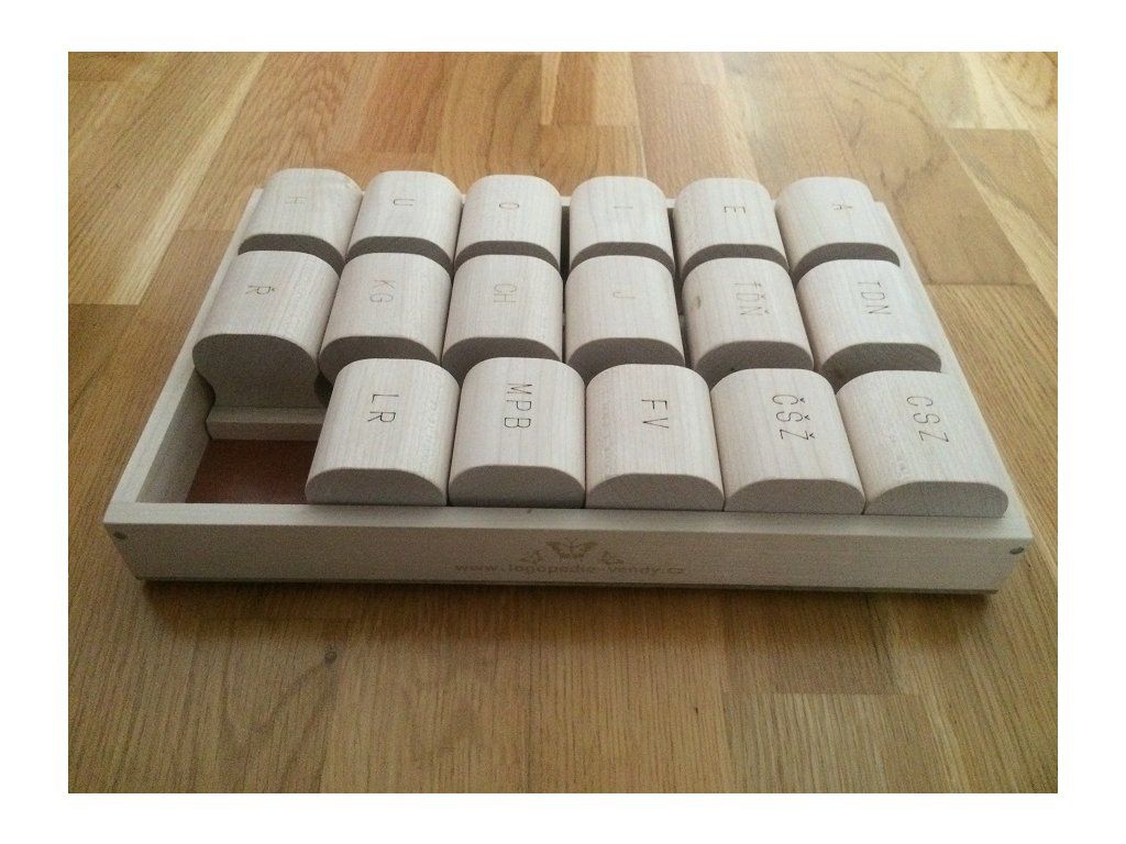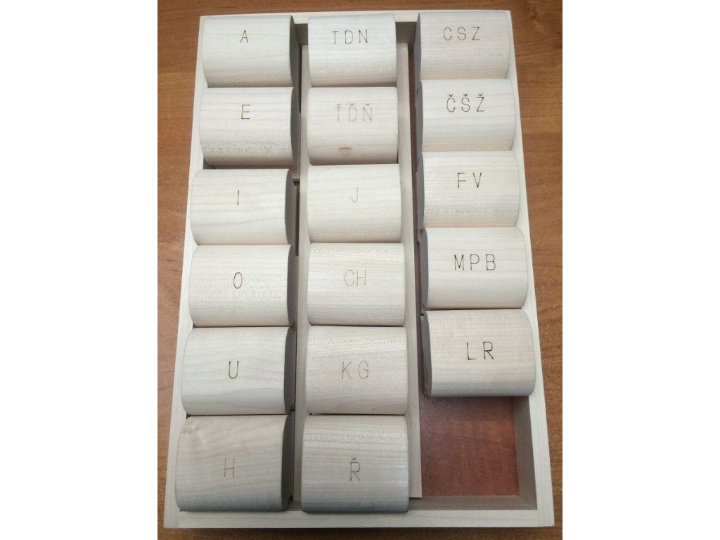 Razítka jsou na dřevěném masivním držátku. Každé razítko má označení, které hlásky se týká.