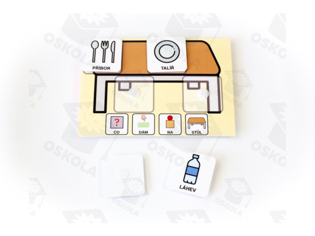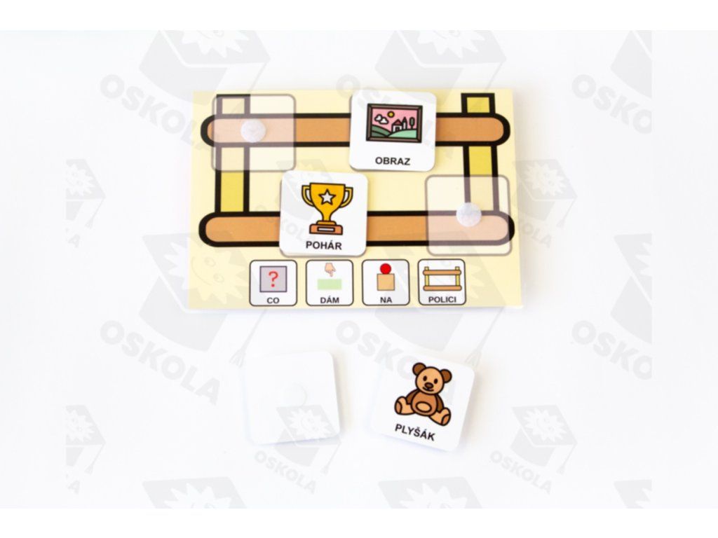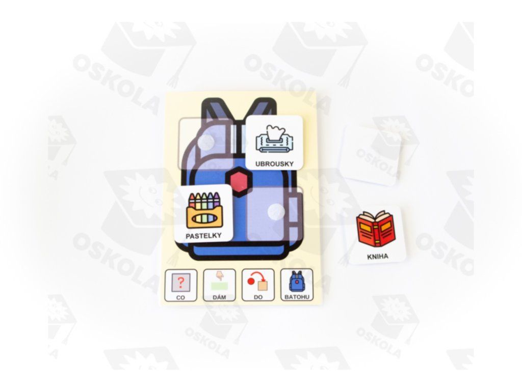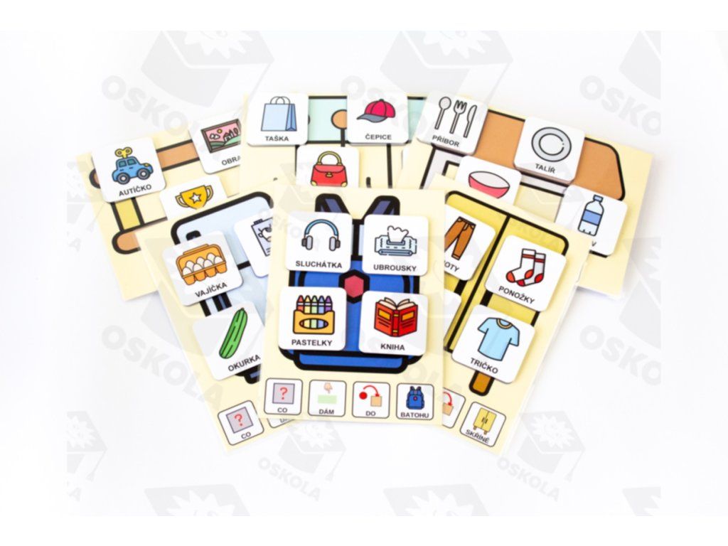 Pomůcka Co kam dám rozvíjí u dětí porozumění, slovní zásobu a schopnost tvořit celé věty. Dítě přiřazuje předměty do různých prostředí (např. batoh, stůl, skříň) a zároveň popisuje, kam daná věc patří.