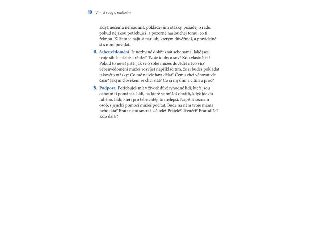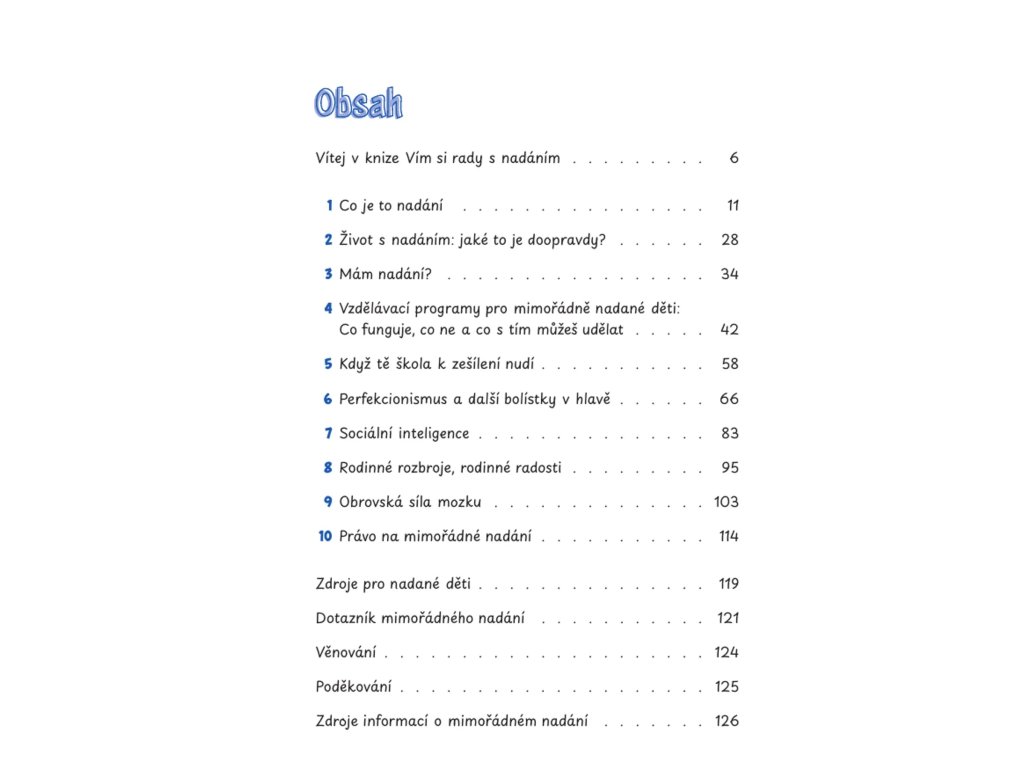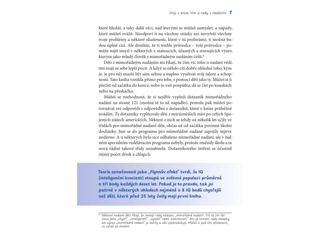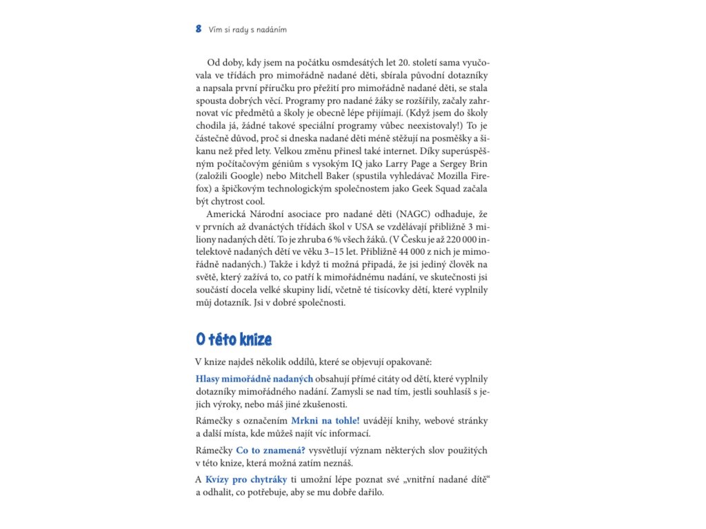 Říkají ti někdy, nebo docela často, že jsi chytrá nebo chytrý? Jdou ti věci rychleji než spolužákům, máš různé speciální zájmy a často toho víš víc než paní učitelka? Pak jsi nadané dítě. Autorka této knihy mluvila s tisícovkou tvých nadaných vrstevníků a zjišťovala, co pro ně znamená být nadaná nebo nadaný, co jim pomáhá zvládat úskalí školního vyučování a co jim pomůže, aby ve škole zapadly. Najdeš v ní tipy pro každodenní život ve škole, rozvíjení přátelských vztahů i komunikaci s učiteli. Naučí se využívat své silné stránky a své nadání dále rozvíjet.